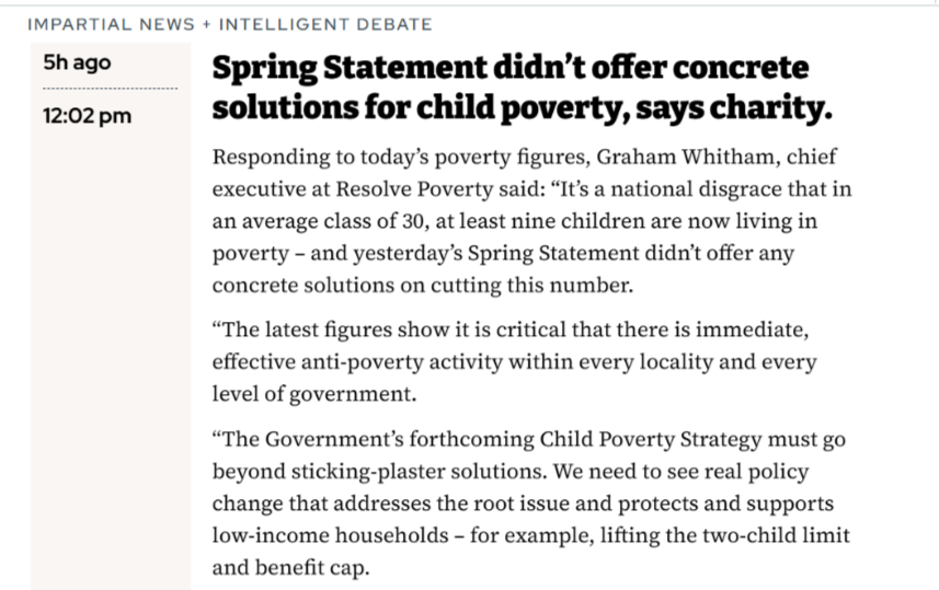 Resolve Poverty actively promotes our own activities and supports national anti-poverty campaigns through the media. This page details some of Resolve Poverty’s recent media appearances. You can also find our latest press statements on this page.
